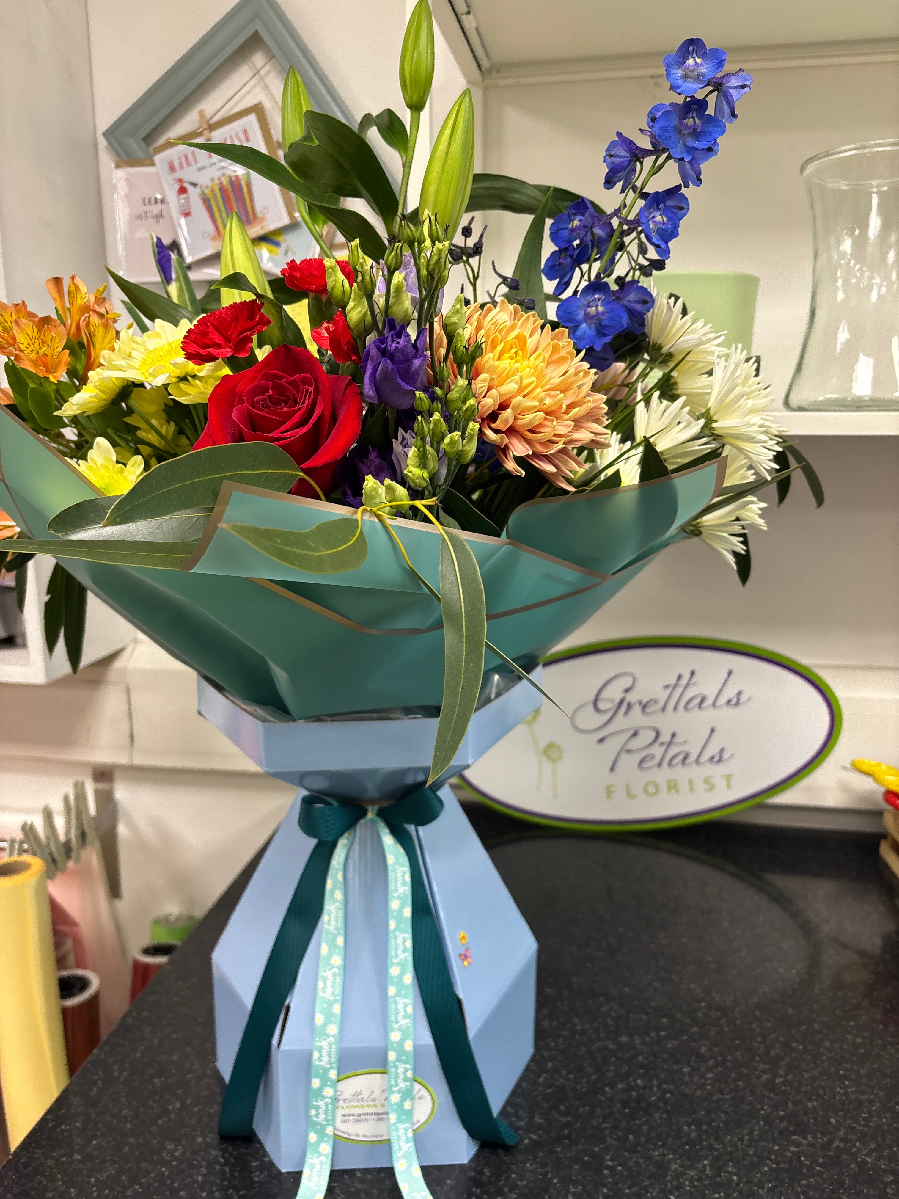 It’s Spring time….Say it with flowers! We use long stemmed fresh cut flowers hand tied, presented in a Floral box cardboard vase which holds water. We use the best blooms in stock, some still in bud, flowers and colours may vary.
