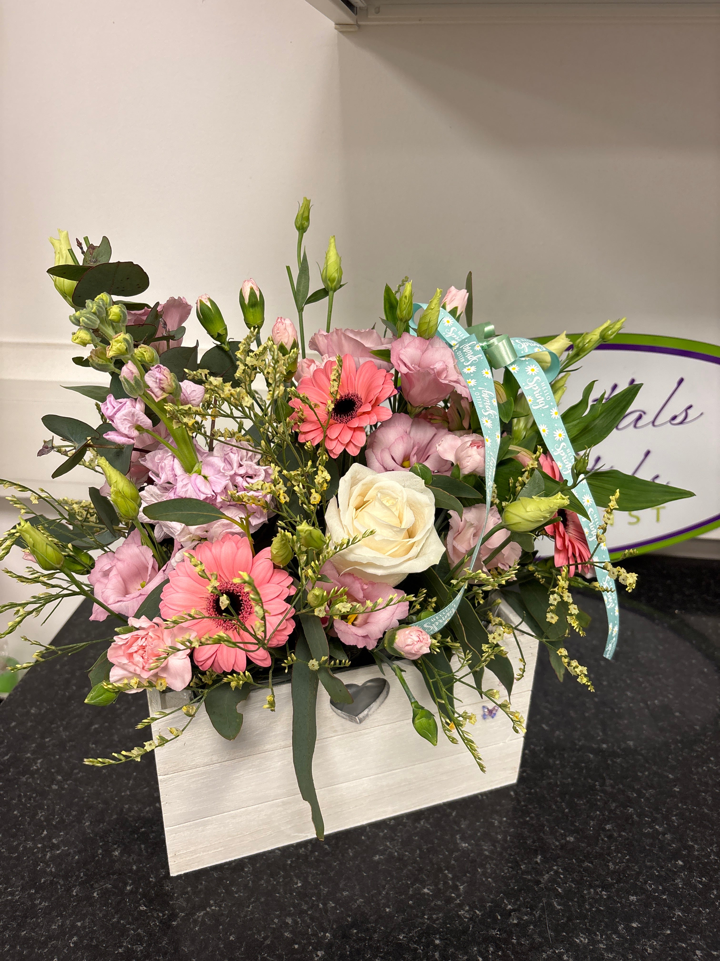 Beautiful flowers in cool pastel tones for the Spring season featuring a “Hello Spring” ribbon decoration in a wooden crate.